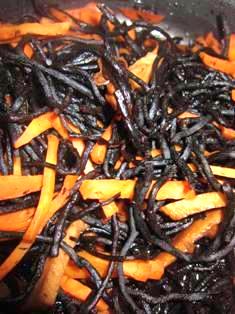 30/10/02つくり方 1 芽ひじきは、たっぷりの水に10分間ほど浸して戻す。 2 豚バラ肉とにんじんは食べやすい長さにして、細切りにする。 3 なべにごま油小さじ2を熱し、 2 を入れて全体に油をなじませる。 水けをきった 1 と大豆を加えたら、合わせておいたAのだしと調味料を注ぐ。 中火で煮汁がほとんどなくなるまで15~分間煮る。.
