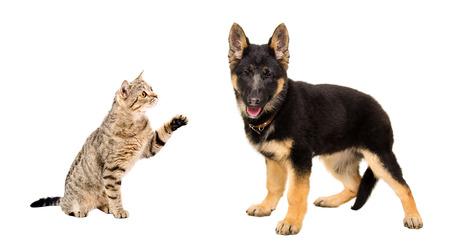 ジャーマン シェパードの子犬と猫スコットランドまっすぐ立っている一緒に白い背景の分離 の写真素材 画像素材 Image